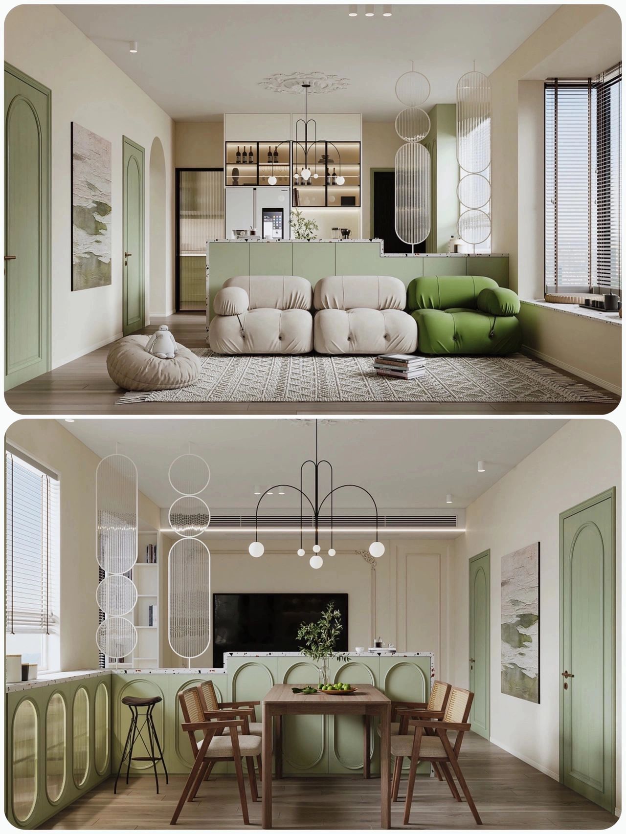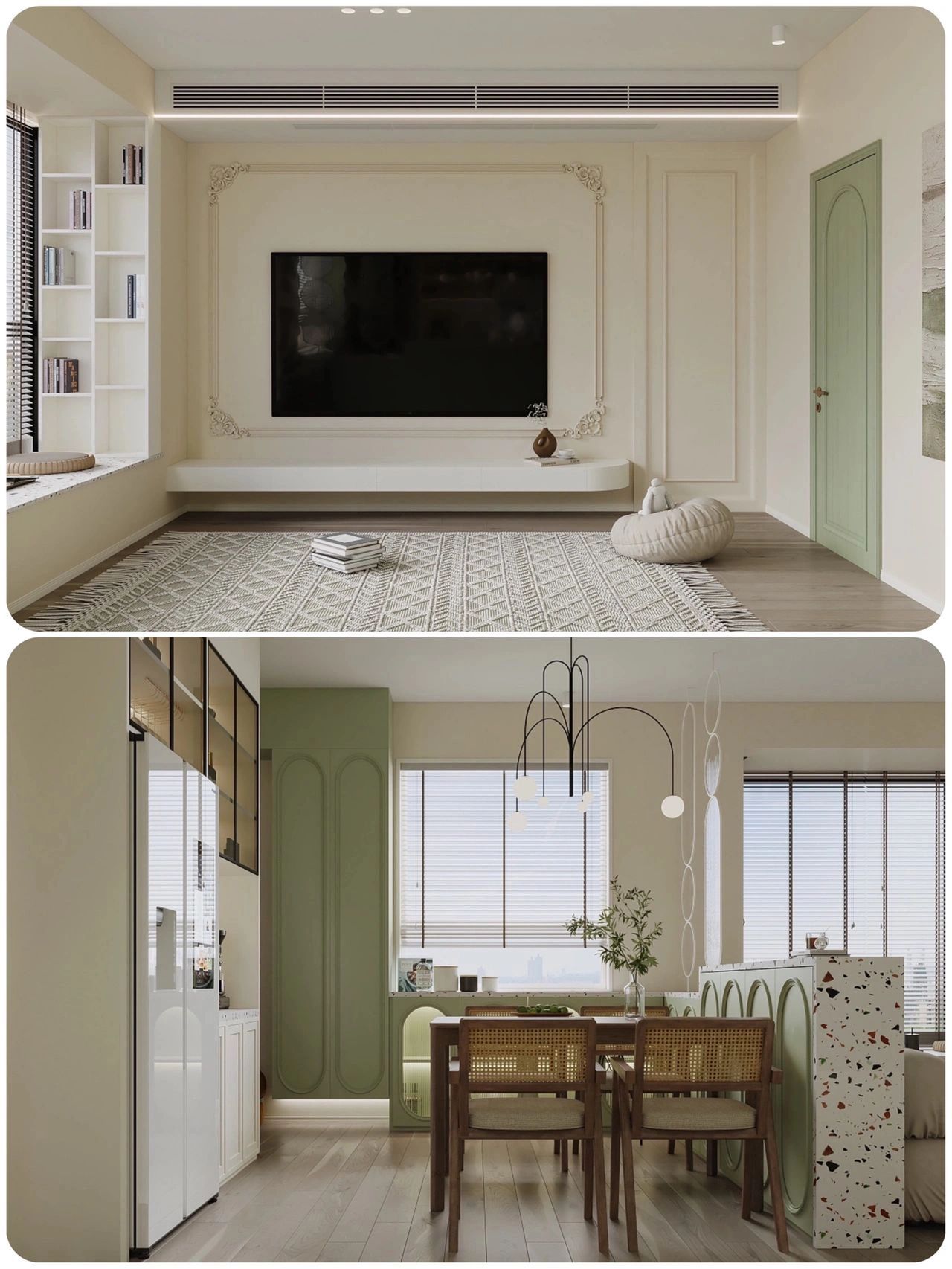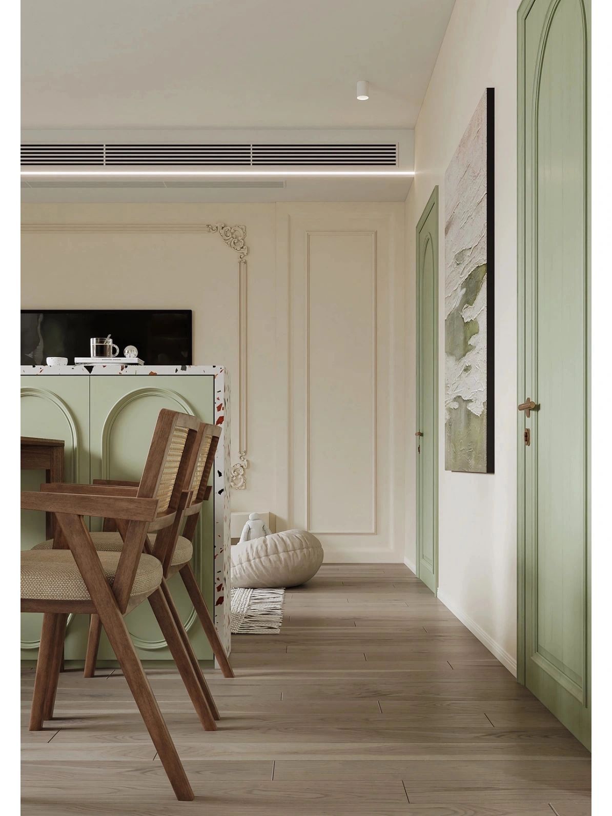 在全屋綠色的鋪陳下,用法式石膏線做裝飾,再加上混搭的現代&復古家居,清新自然又復古高級~