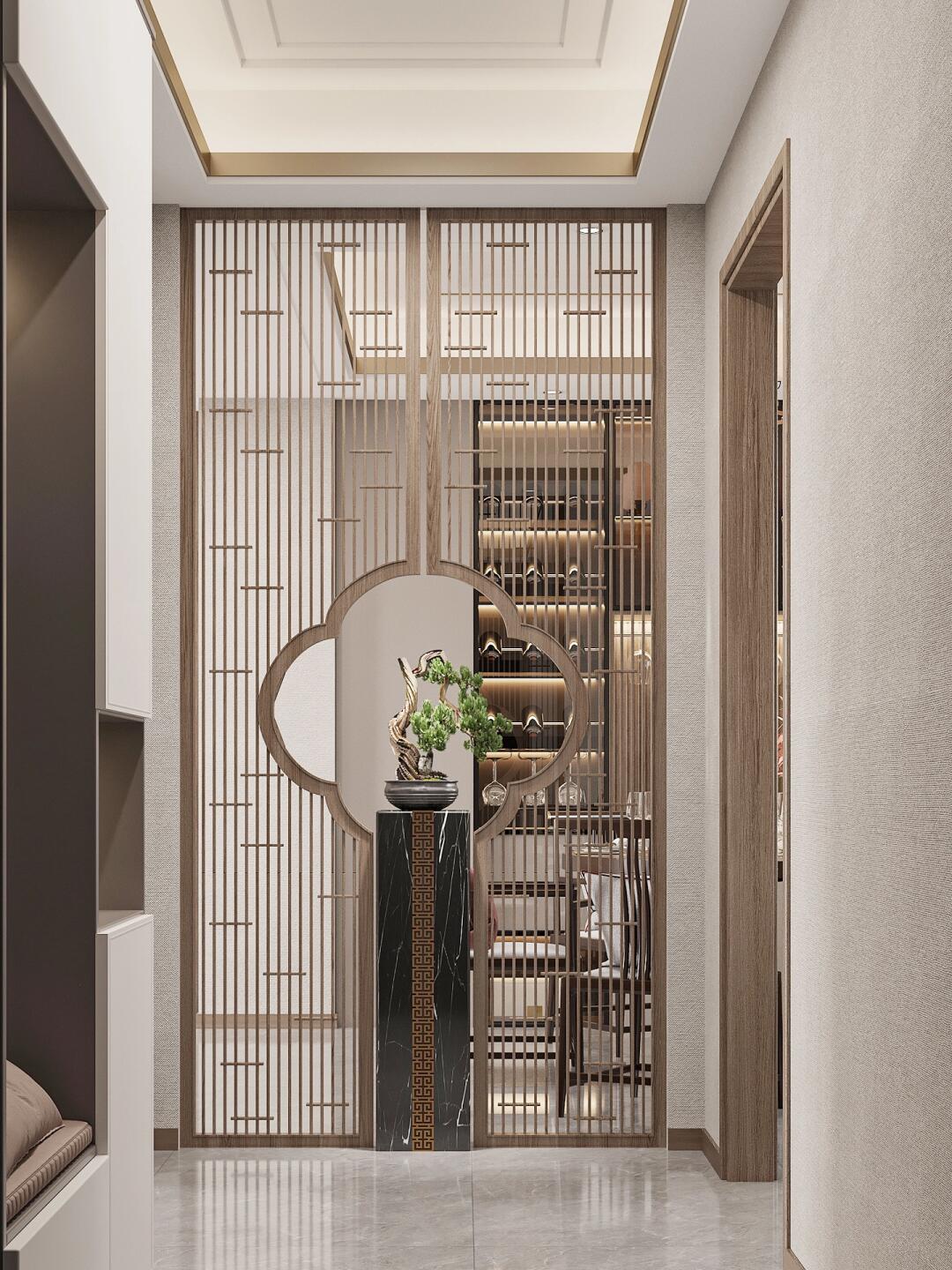 本身空間狹小且光照不足,在餐廳與門(mén)廳之間的選用鏤空木柵欄。