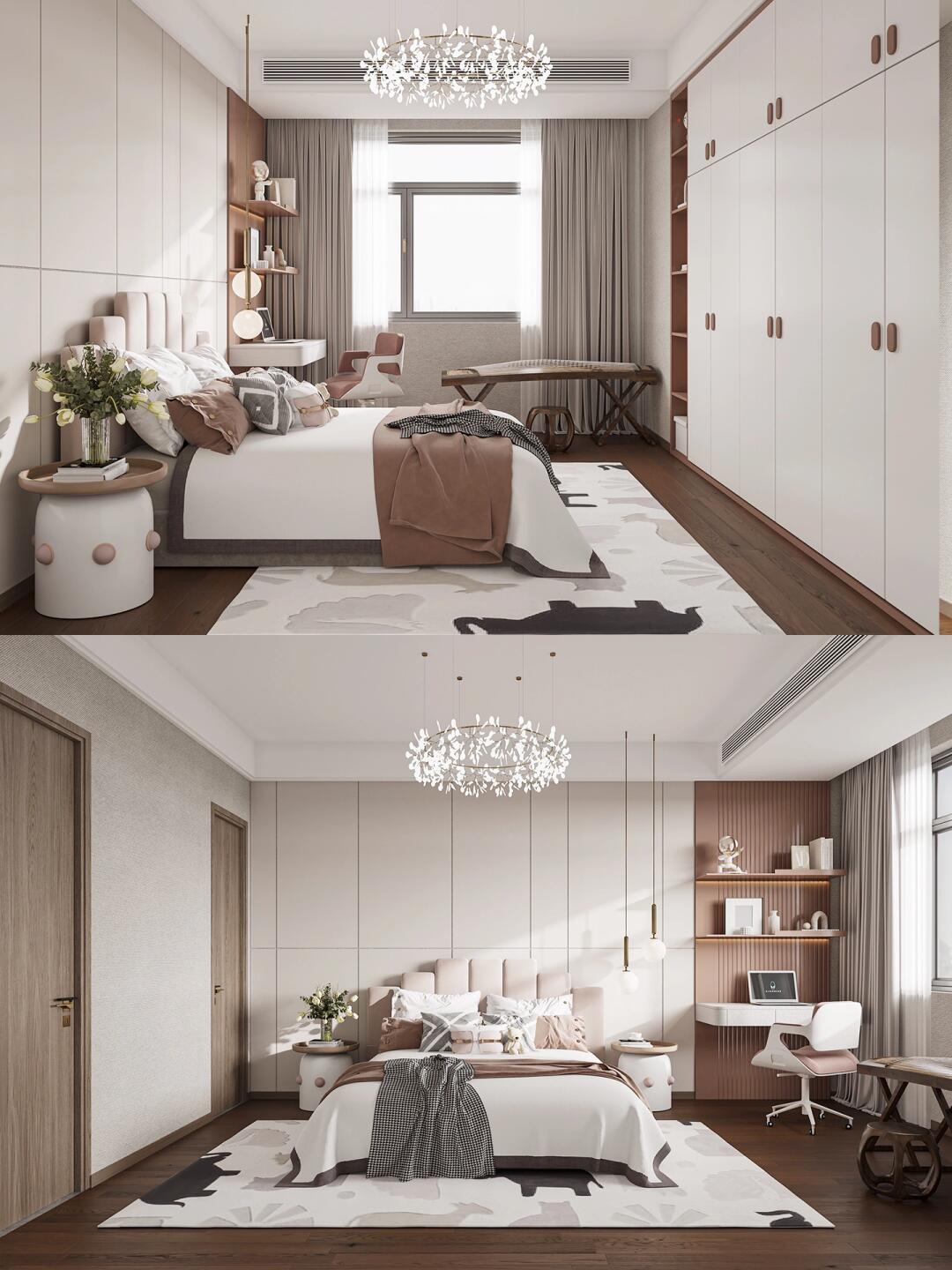 整體以米白色為主,溫馨且利落,同時(shí)又搭配一些卡通擺件及掛畫(huà),打破沉悶感,增加了空間的趣味性。