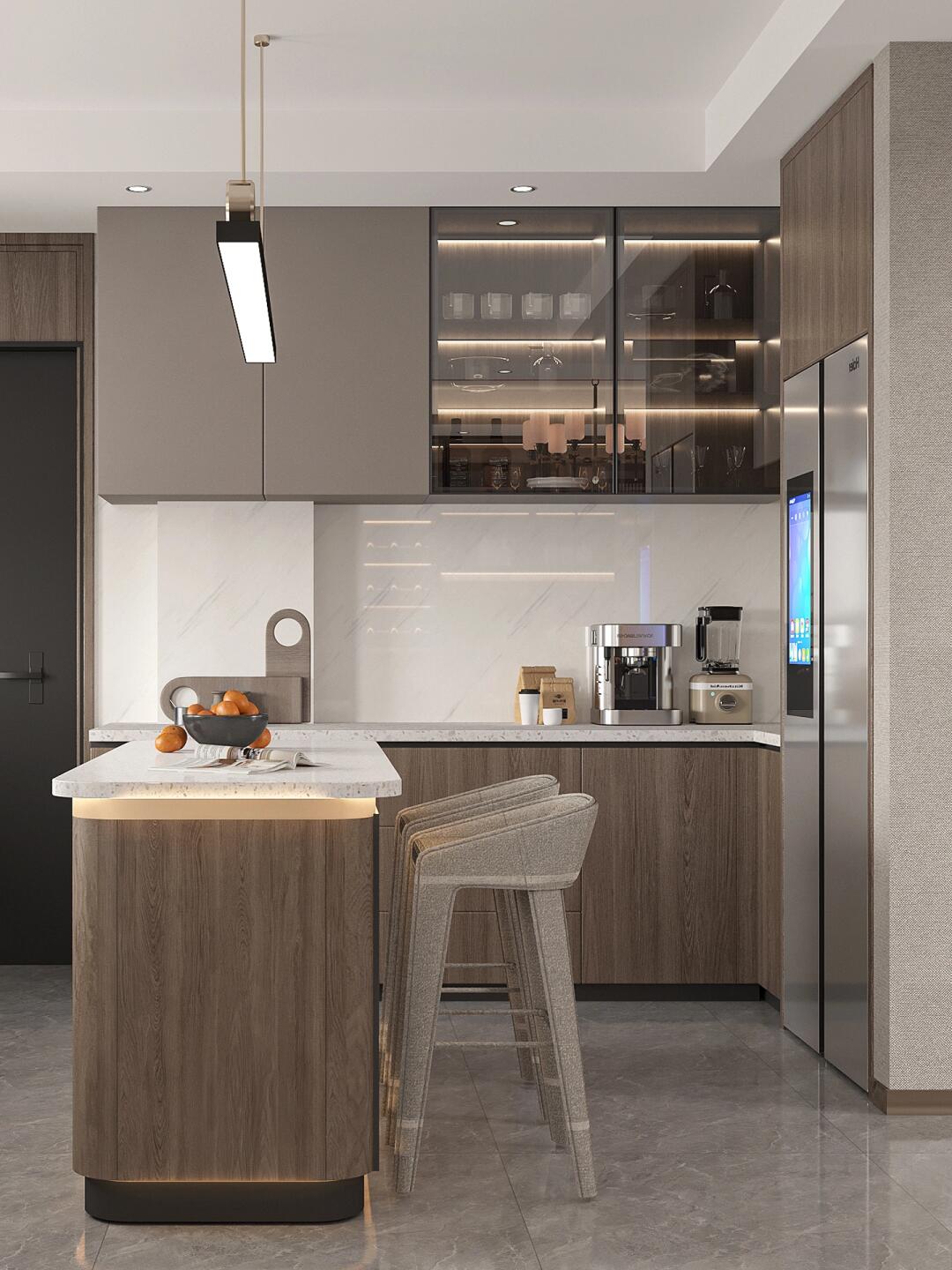 這種高級(jí)、時(shí)尚、簡(jiǎn)約的調(diào)性極具富有現(xiàn)代氣息。柜體同樣以白色和卡其色為主,與客餐廳相呼應(yīng)。