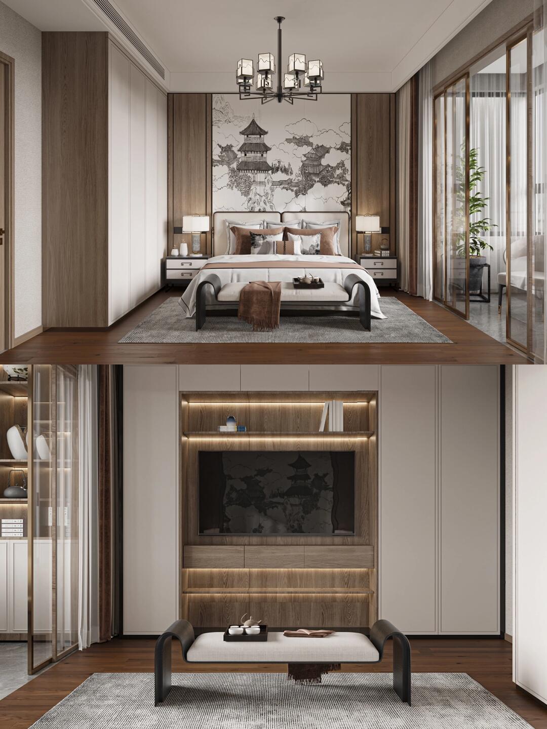 主臥室在飾品的選用上同樣以簡(jiǎn)約風(fēng)格為主,咖色床品搭配木飾面的床頭高背景墻。