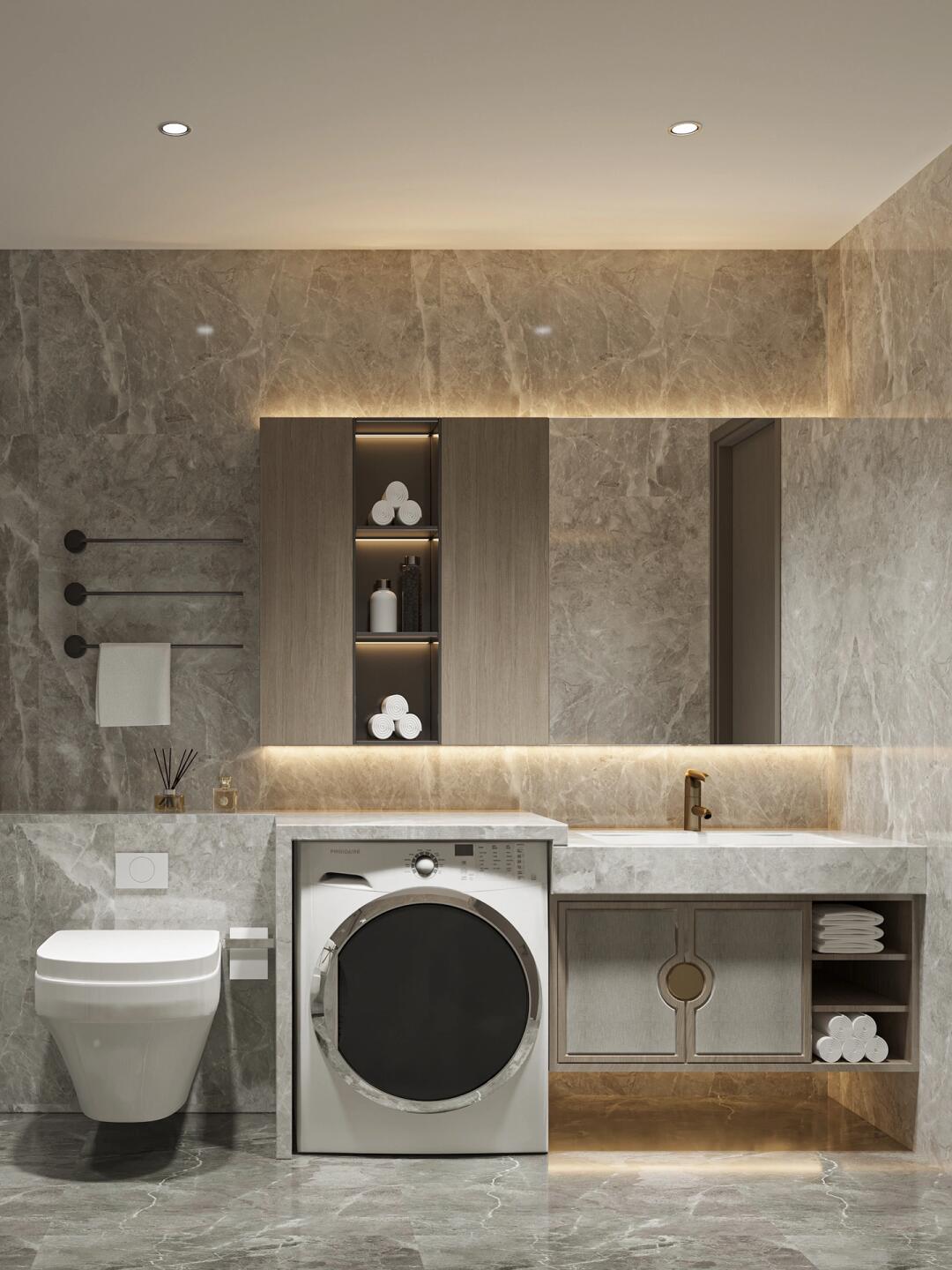 同樣以簡(jiǎn)約為主,白色大理石直接上墻,與卡其色柜體銜接。