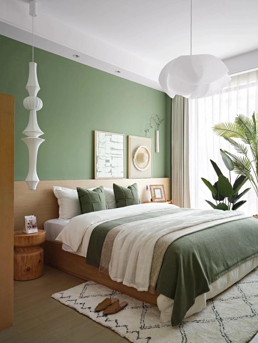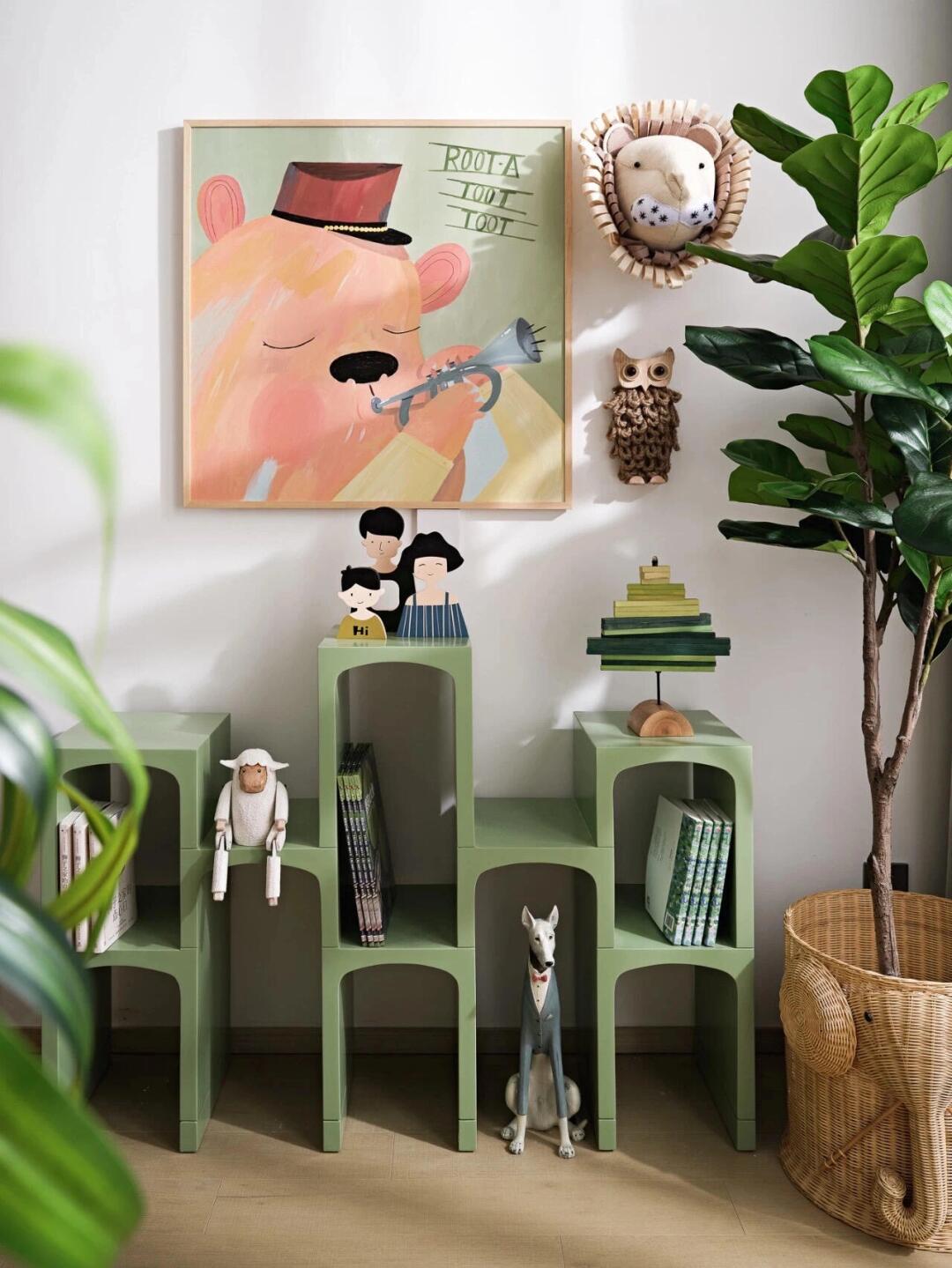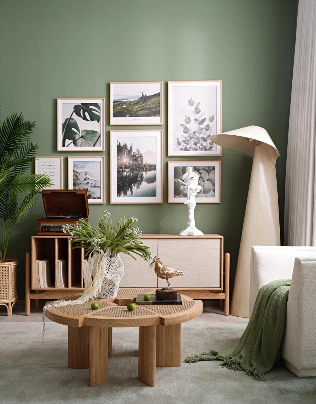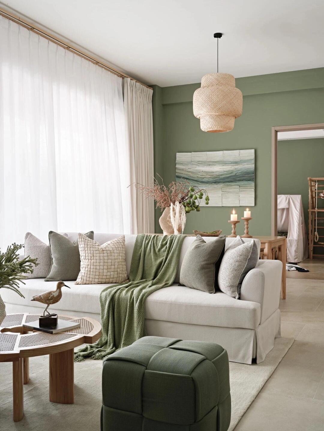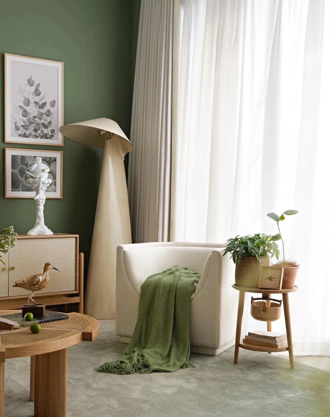 在客廳空間內(nèi)布局了大量的綠色家具、物件,墻壁的顏色也選用森林綠,