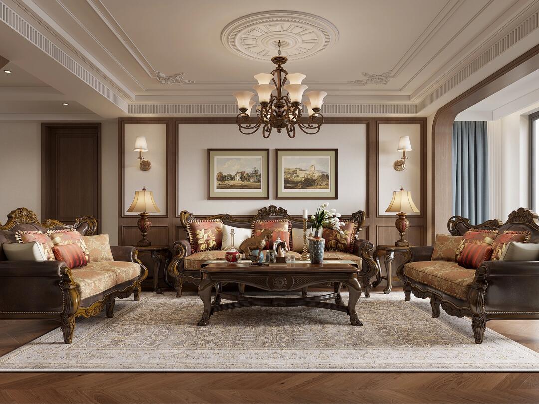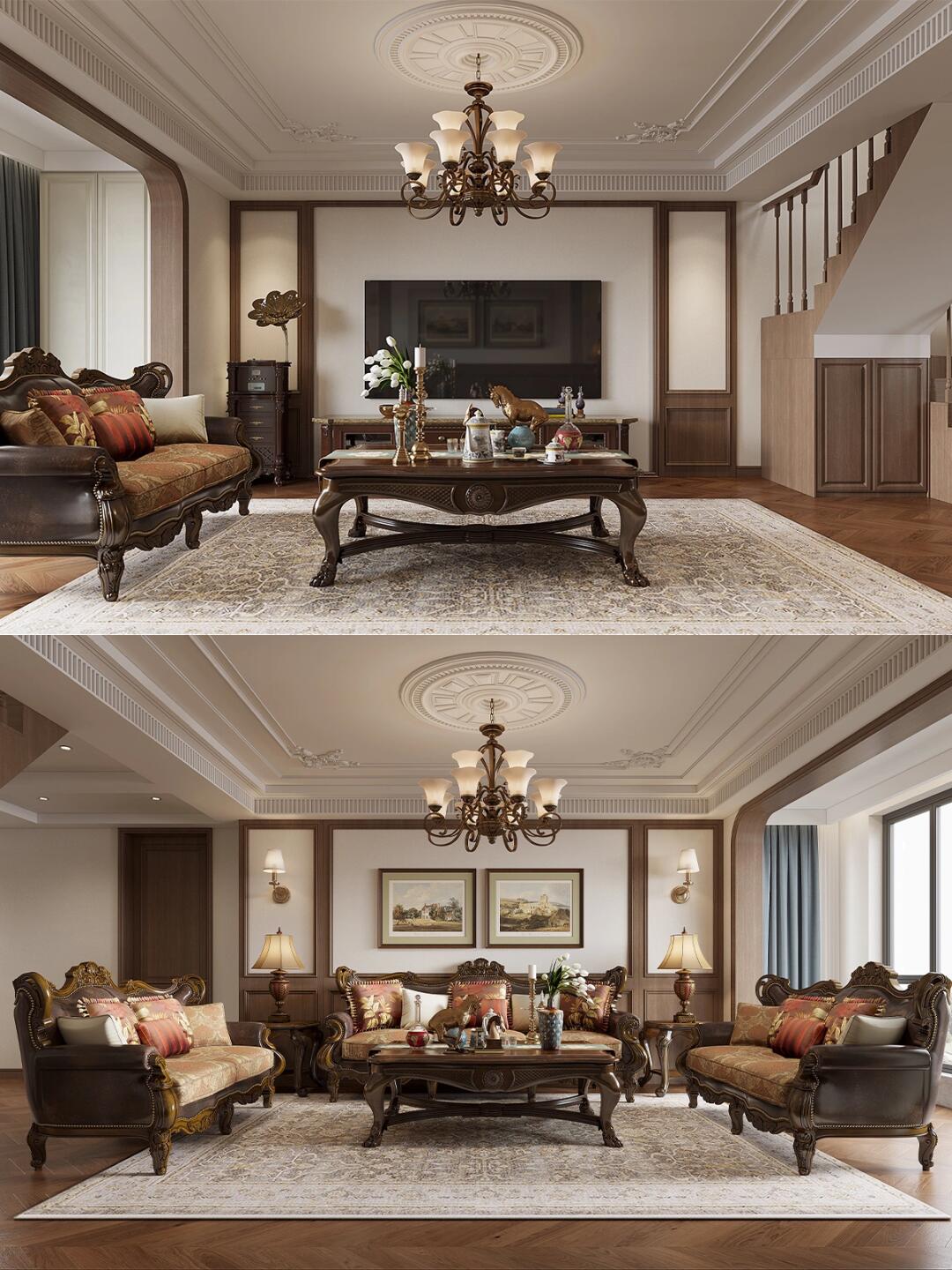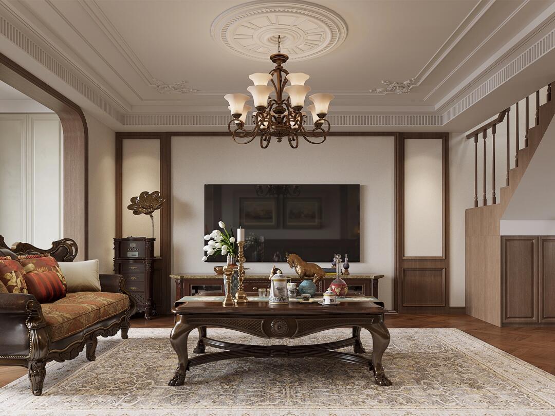 在空間及軟裝設計上遵循美式風格文化的精髓空間主色調用棕紅打造一個奢華與細膩并存的家居空間。