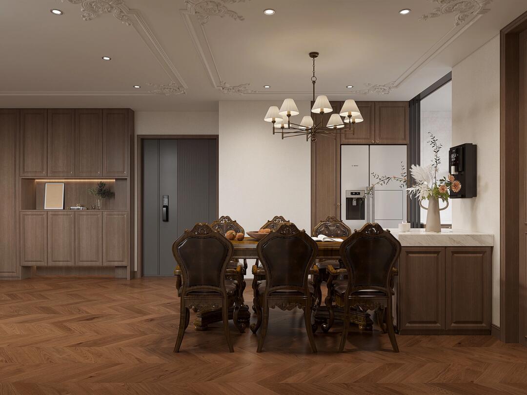 搭配了美式線條在空間中的描繪,并以深咖色作為基調,營造出了溫和優雅而樸實的空間氛圍。