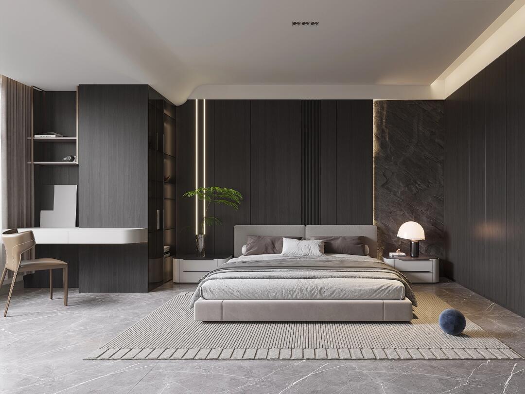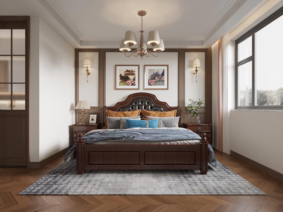 主臥遵循古典美式的獨特韻味,深咖色墻板自帶高級復古感,