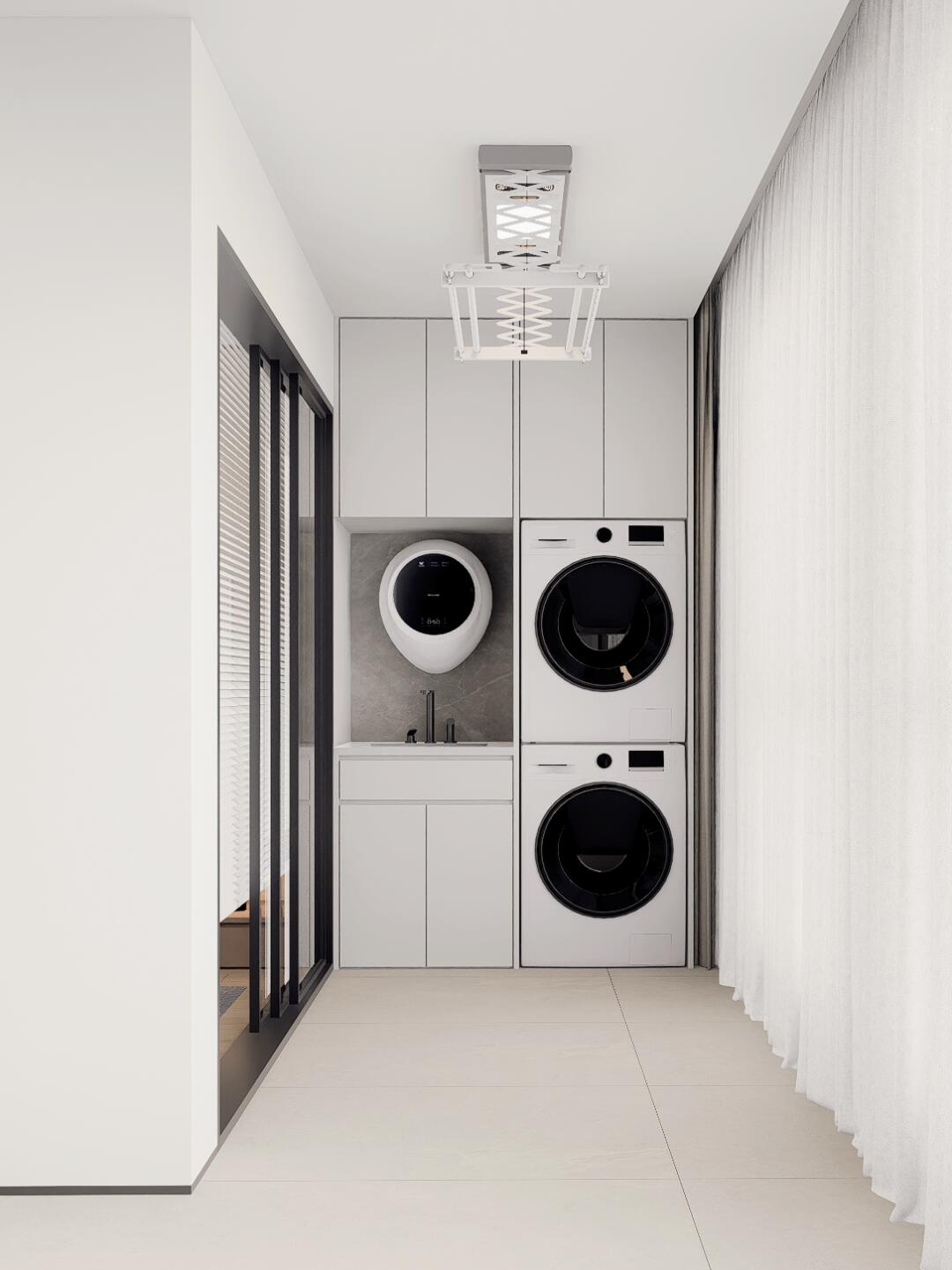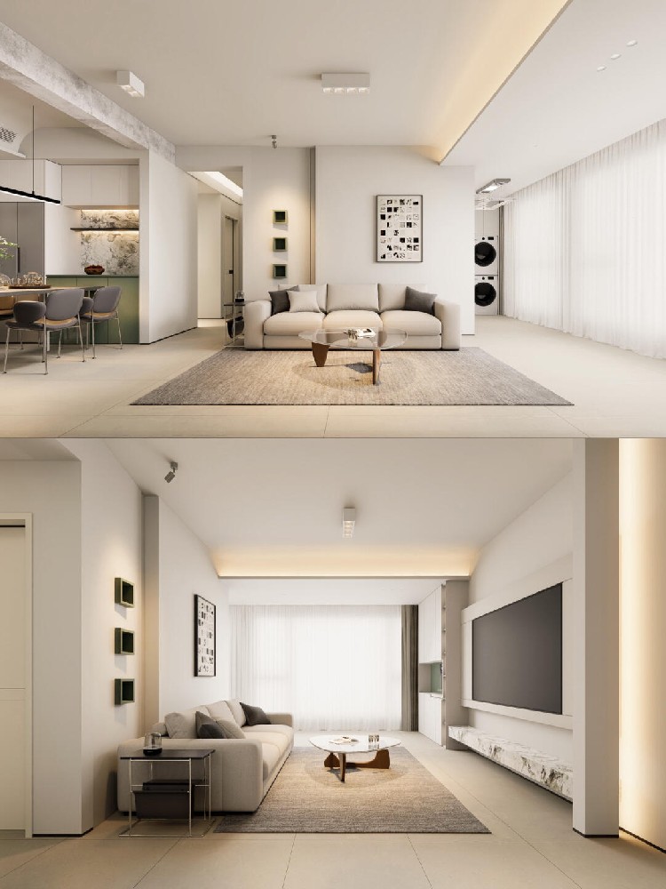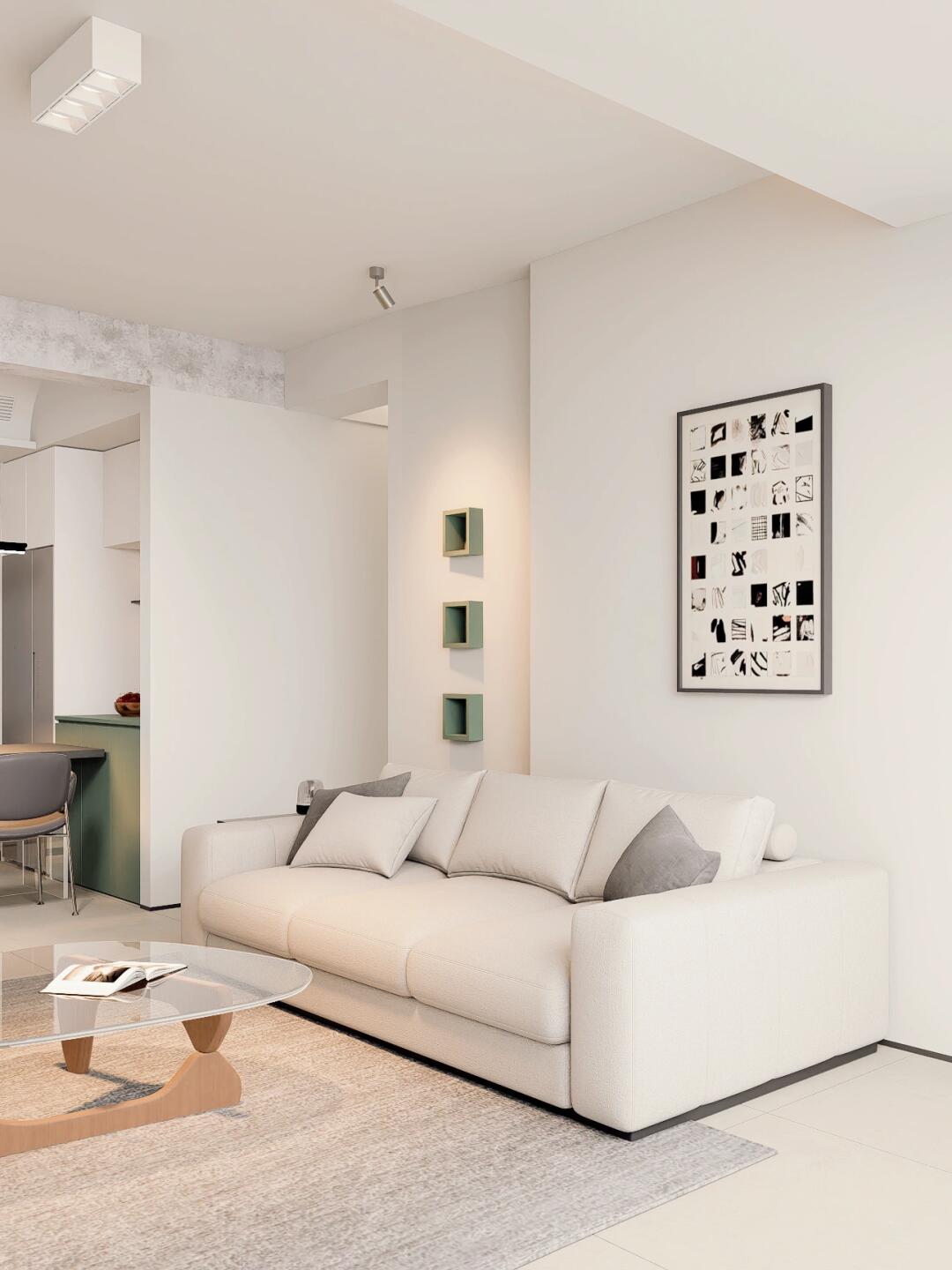 客廳的地面選擇暖灰素色磚,墻面刷上菱花白乳膠漆,天花與墻頂同色,