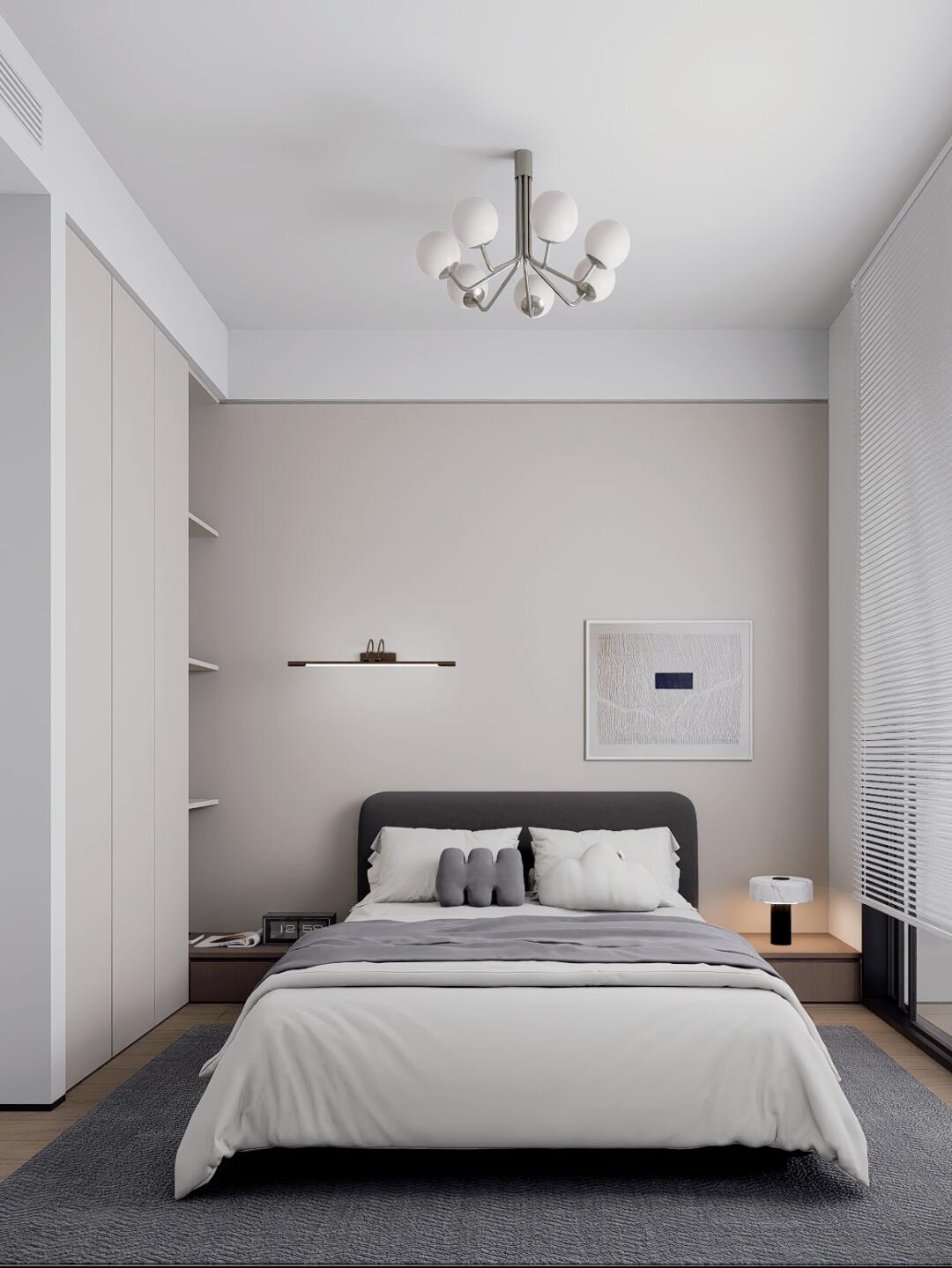臥室里木地板搭配暖灰色涂料作為背景墻,其它墻面和單品軟裝大多以白色為主,營造出溫馨又靜謐的睡眠氛圍。