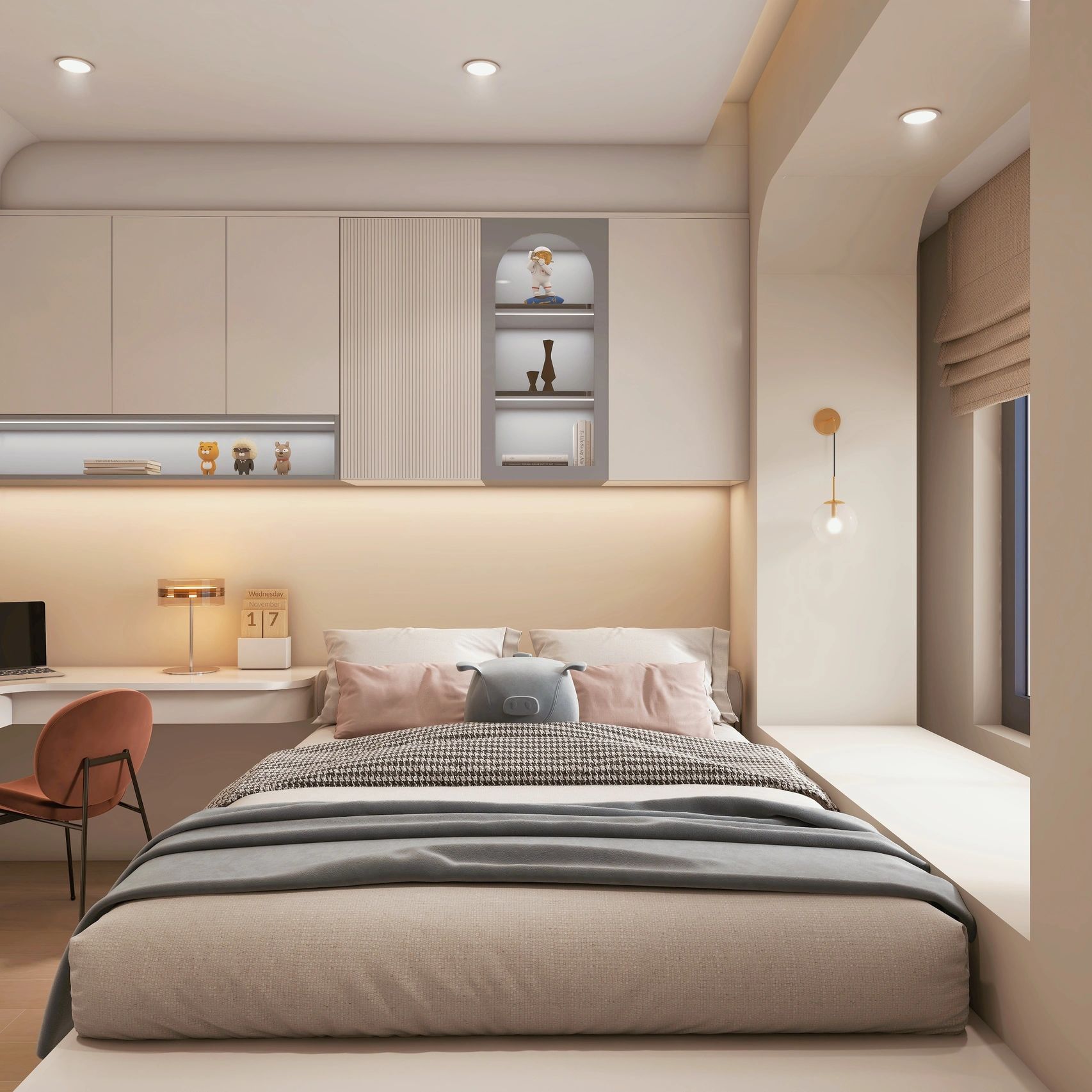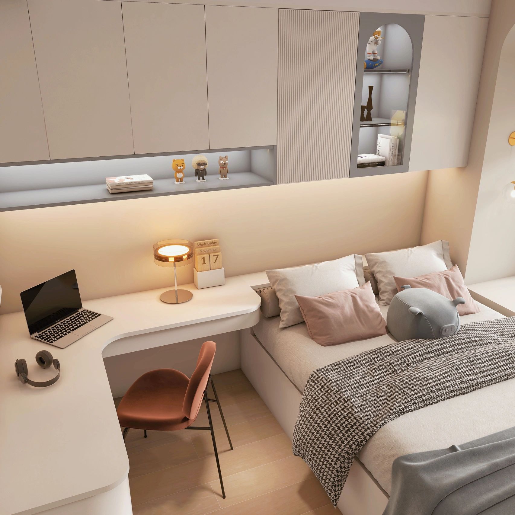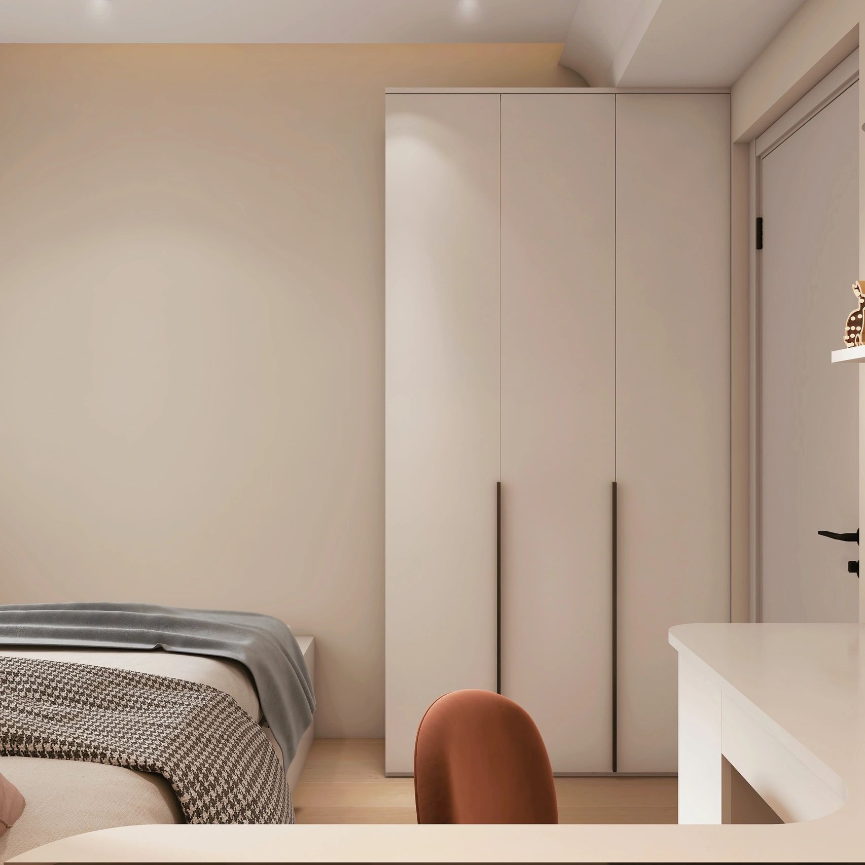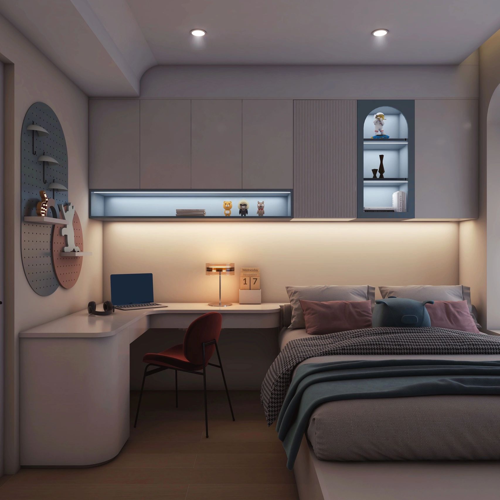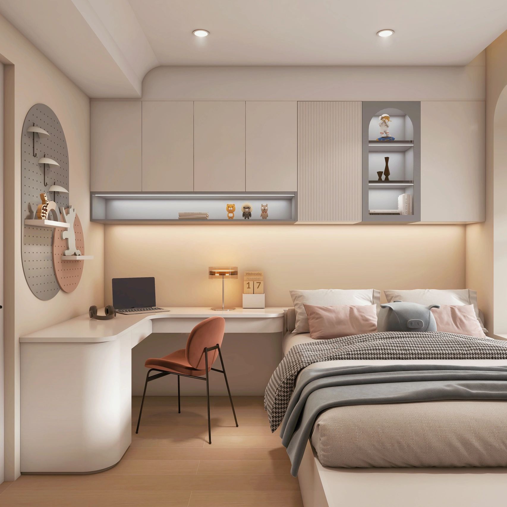 L型書桌+書柜+衣柜讓小孩有學習空間的同時也有儲物空間