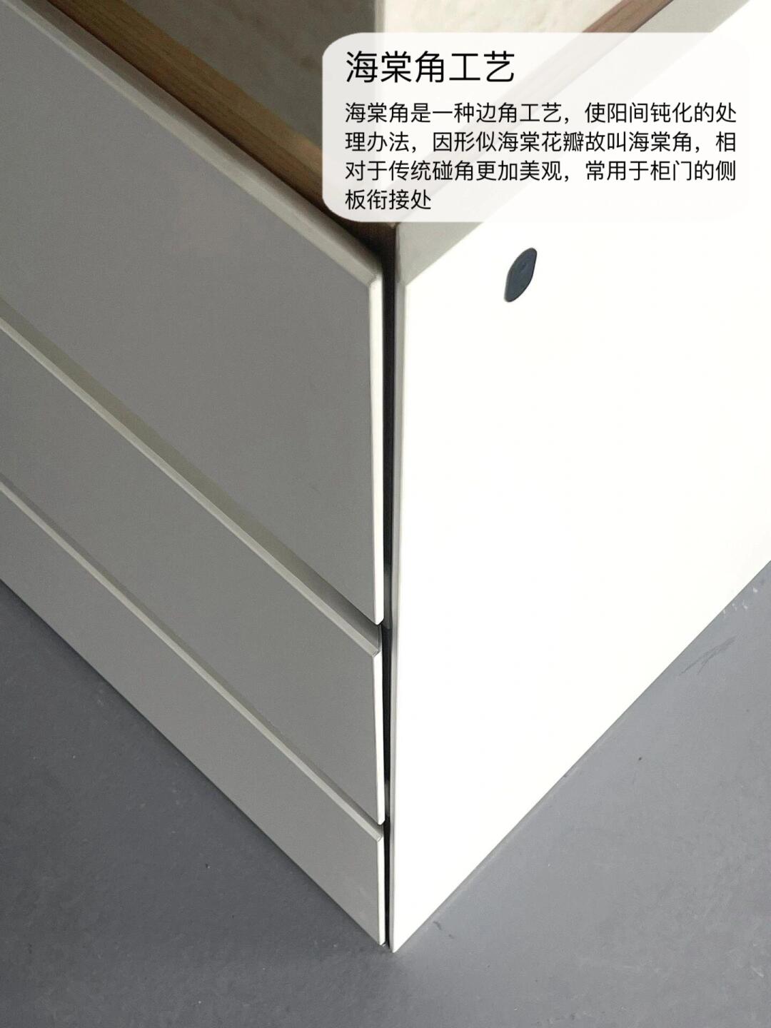 海棠角是一種邊角工藝,是指在建筑裝飾或家具制作中,一種使陽角鈍化的處理辦法,因其形似海棠花瓣故叫海棠角,相對于傳統碰角,海棠角更加美觀,立體感強,常用于柜子的抽面和側板銜接,柜門的側板的銜接處。