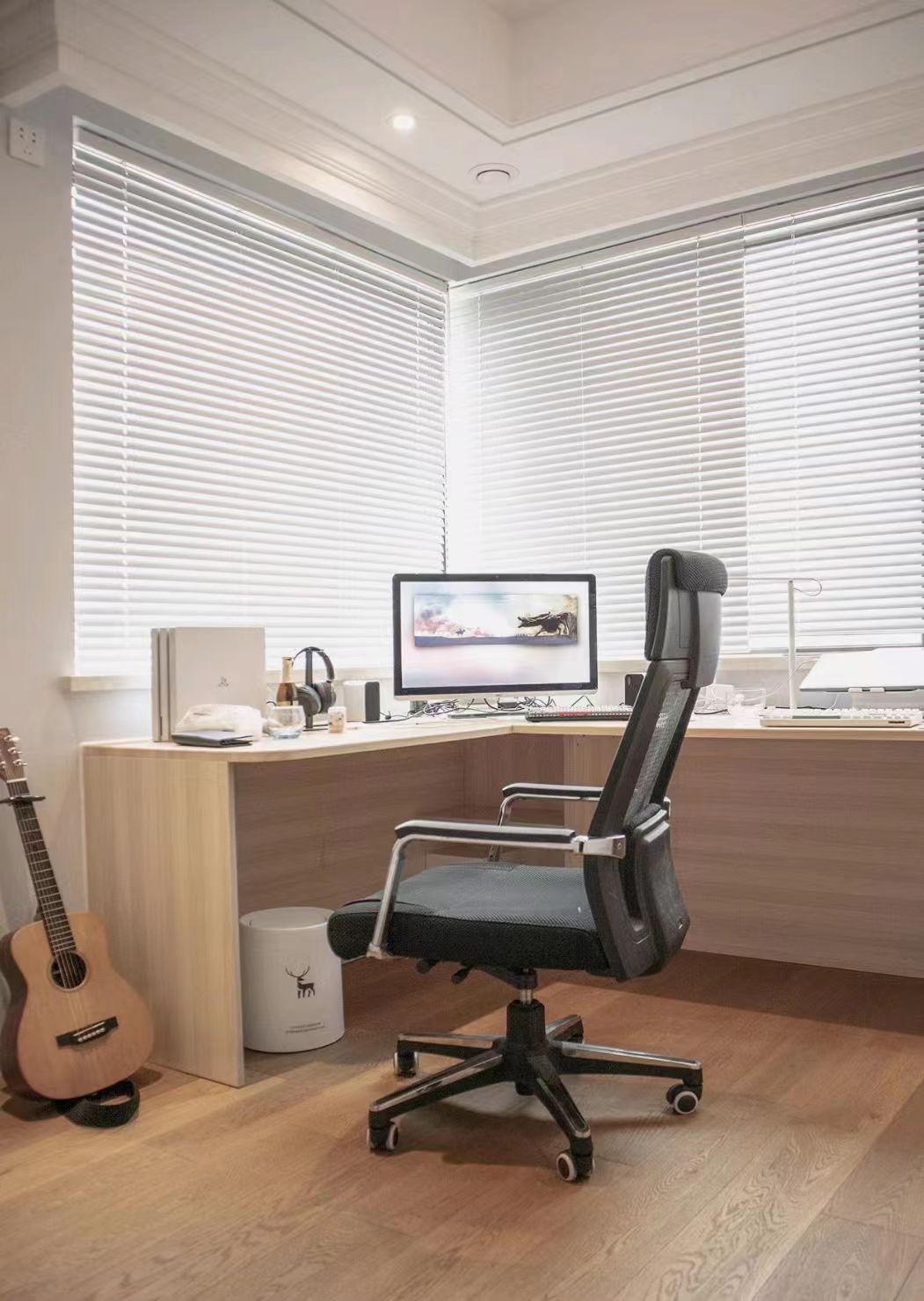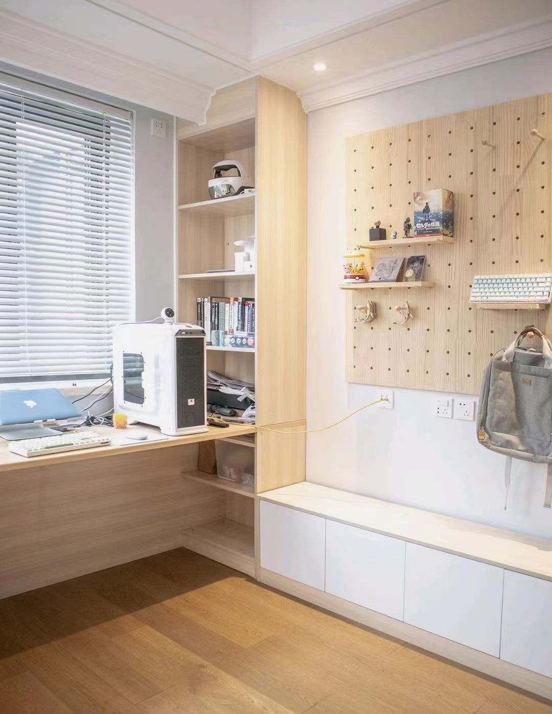 考慮到家中有小朋友,再結(jié)合自己的喜好,用書柜和書房的形式,為自己做了一個小清新的書房。
